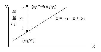 Y=b1・x+b0 なる直線は全ての標本データについて、その残差が最小になるようにひく必要がある。この直線から各標本データとのズレ具合いを計るために、各残差の平方和をとり、この平方和を最小にするようにする。このような方法を最小2乗法という。