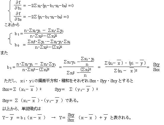 この式をb0,b1で偏微分して、0とおくことにより、正規方程式を得て、式fを最小 にするb0・b1を得ることができる。