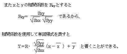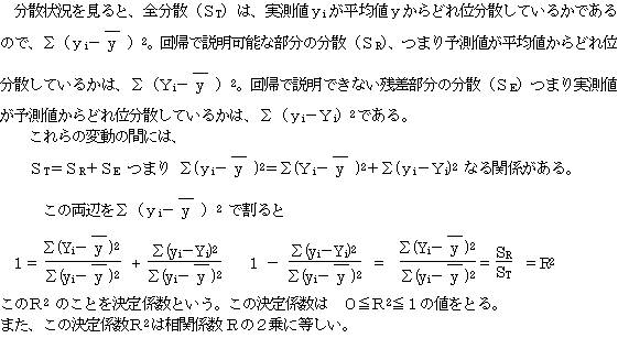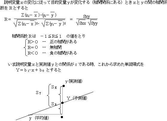 実測値yは、単回帰直線の付近にばらついて散在している。このばらつきの小さいほど単回 帰式のあてはまりがよい(精度が高い)直線といえる。また説明変量xの目的変量に与える影響が大きいといえる。つまり決定力が大きいといえる。