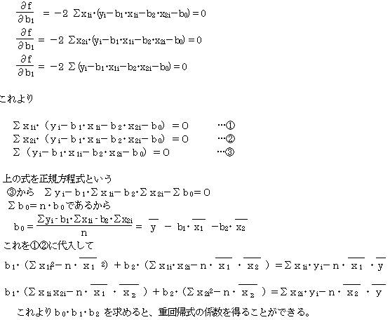f=煤iyi−b1・x1i−b2・x2i−b0)2 とし、この式をb0・b1・b2で偏微分する。