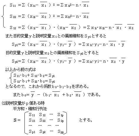 説明変量x1・x2 の偏差平方和それぞれS11・S22、偏差積和をS12とすると