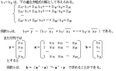 求める重回帰式を、Yi=b1・x1i+b2・x2i+…+bp・xpi+b0 とする、この回帰式の係数b0・