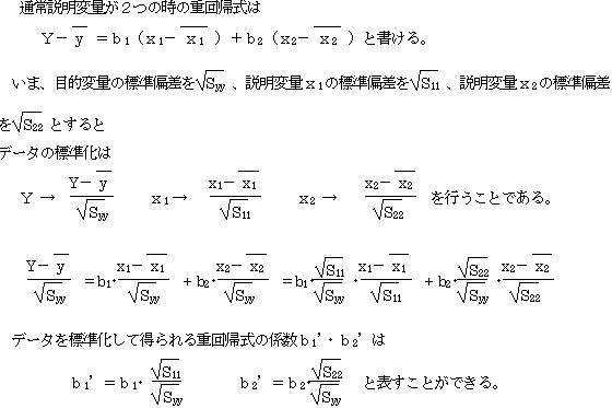 説明変量がどれくらい目的変量に影響を与えているか(寄与しているか)を見るには、求めた重回帰式の偏回帰係数を見ればよい。通常、偏回帰係数が大きいほど目的変量に与える影響が大きいので多く寄与しているといえる。しかし、説明変量間で単位が異なるときには、単位の影響を受けるので、単純に偏回帰係数の大小比較して決めることはできない。単位の影響を除くには、標本データを標準化する。データを標準化することにより、平均=0・分散=1となり単位の影響を受けなくなるので、標準化したデータから偏回帰 係数を求めるようにする。このように標準化したデータから得られた偏回帰係数を、標準 偏回帰係数という。