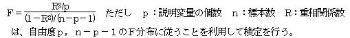 標本から得られた重相関係数について、その母重相関係数(ρ)が無相関かどうかの検定を 行う。標本から得られた重相関係数をRとする時、その母相関係数(ρ)についてρ=0の仮説につき、検定統計量をFとすると