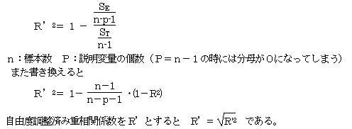 そこで、単純に説明変量の数を増やしても、決定係数が単純に増加しないように調整した 自由度調整済み決定係数という。通常標本数がn個、説明変量がn−1個のものは分析することができない。必ず説明変量がn−2個以下にする必要がある。