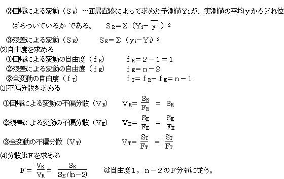 回帰式を使用して説明変量から目的変量の値を予測する時、その予測値がどのくらい信頼性 があるのかを検定する方法に、分散分析を用いる方法と相関係数を用いる方法がある。