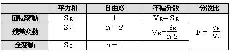 右片側検定を行い、VRがVEより大きいかどうか検定する。VR>VEであれば、回帰による変動が残差による変動よりも全変動に与える影響が大きいので、回帰直線は予測に役立つといえる。