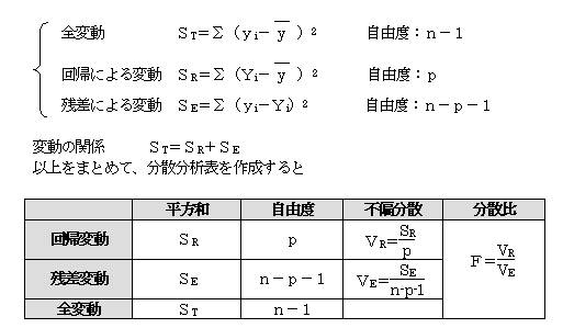 単回帰同様に、全体の変動を回帰による変動と残差による変動とに分け、分散分析表を作 成し重回帰式の信頼性を検定する。