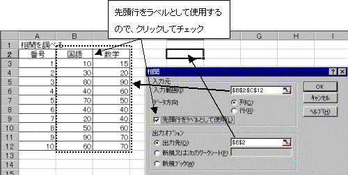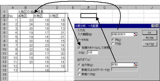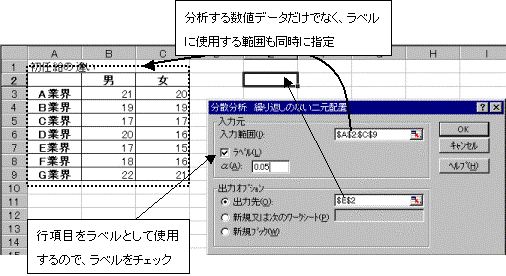 “ü—͔͈͂ÍA€–ÚsiA’n‹æEB’n‹æEC’n‹æ‚Ì•¶Žš‚Ìsj‚ðŠÜ‚߂Ĉê“x‚̃hƒ‰ƒbƒO‚µ‚Ä•ªÍ‚·‚éƒf[ƒ^”͈͂ðŽw’è‚·‚éB擪‚Ì•¶Žš—ñ‚Ìs‚̓‰ƒxƒ‹‚Æ‚µ‚ÄŽg—p‚·‚é‚Ì‚ÅAu擪s‚ðƒ‰ƒxƒ‹‚Æ‚µ‚ÄŽg—pv‚Ì—–‚ðƒNƒŠƒbƒN‚µ‚ă`ƒFƒbƒN‚·‚éBo—Íæ‚ðŽw’肵AOKƒ{ƒ^ƒ“‚ðƒNƒŠƒbƒN‚·‚邯‚·‚ׂÉu‚PŒ³”z’u•ªŽU•ªÍ•\v‚ªŒvŽZ‚³‚ê•\ަ‚³‚ê‚éB