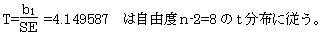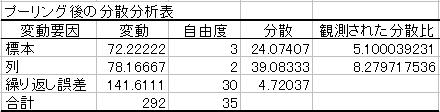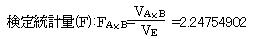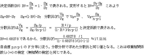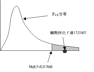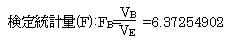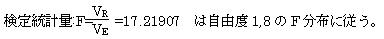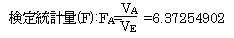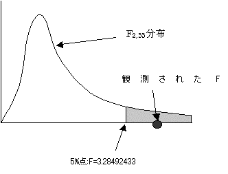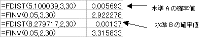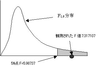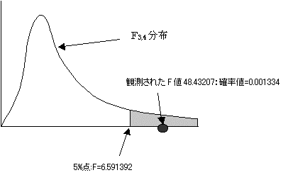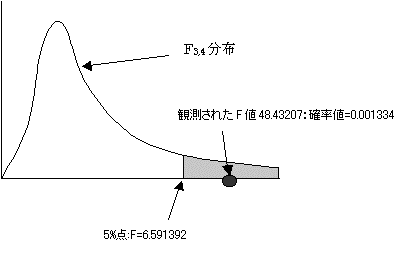 •ªŽU”ä(F):48.432070@•ªŽU”ä(F)‚ÌŽ©—R“x‚Í2‚‚ ‚èAŒvŽZŒ‹‰Ê‚Í2”Ô–Ú‚ÌŽc·‚ÌŽ©—R“x‚ª•\ަ‚³‚ê‚Ä‚¢‚éB1”Ô–Ú‚ÌŽ©—R“x‚ÍA‰ñ‹A•Ï“®(SR)‚ÌŽ©—R“x‚Å‚ ‚èAà–¾•ϗʂ̌”(p)‚Å‚ ‚éB‚¢‚Ü‚Í3‚ÂŽg—p‚µ‚Ä‚¢‚é‚Ì‚ÅA1”Ô–Ú‚ÌŽ©—R“x‚Í3‚Å‚ ‚éB2”Ô–Ú‚ÌŽ©—R“x‚ÍAŽc·•Ï“®(SE)‚ÌŽ©—R“x‚Å‚ ‚èA•W–{”(n)-à–¾•ϗʌ”(p)-1‚Å‚ ‚éB‚±‚ê‚Í4‚ÆŒvŽZ‚³‚ê‚Ä•\ަ‚³‚ê‚Ä‚¢‚éBˆÈã‚©‚çŠÏ‘ª‚³‚ꂽ•ªŽU”ä(F)‚ÍŽ©—R“x3,4‚ÌF•ª•z‚É]‚¤B‚³‚ç‚ÉŠÖ”‚ðŽg—p‚µ‚ÄF3,4(0.05)‚ð‹‚ß‚ê‚ÎA㑤5%“_‚ÌF’l‚ª‚í‚©‚é‚Ì‚ÅA‚±‚Ì’l‚ÆŠÏ‘ª‚³‚ꂽ•ªŽU”ä(F)‚ð”äŠr‚·‚ê‚΂悢BF3,4(0.05)‚ÍŠÖ”‚Å‚ÍA=finv(0.05,3,4)‚Å‚ ‚èA‚±‚Ì’l‚Í6.591392321‚Æ•\ަ‚³‚ê‚éB‚Ü‚½•ªŽU”ä(F):48.432070@Ž©—R“x3,4‚ÌŠm—¦’l‚ÍA=fdist(48.43207,3,4)‚©‚ç0.001334‚Æ‹‚ß‚ç‚ê‚éBˆÈã‚ð‚܂Ƃ߂Å}•\•\ަ‚·‚邯‰º‚̂悤‚ȃOƒ‰ƒt‚ƂȂéB‚±‚ê‚Í•ªÍƒc[ƒ‹‚Å‹‚ß‚½’l‚Æ“¯‚¶‚ɂȂéB
