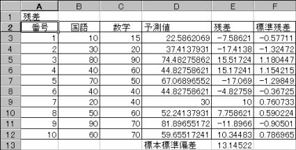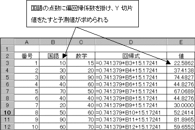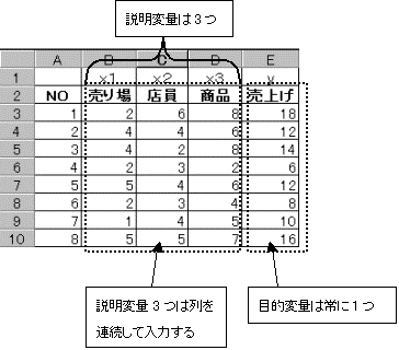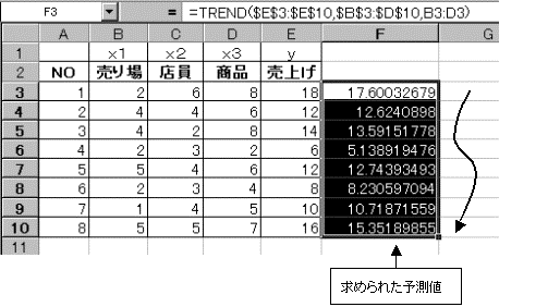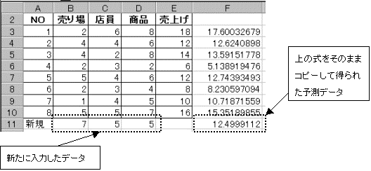 ”„‚èê\¬“x:7@“Xˆõ‹³ˆç“x:5@¤•i[ŽÀ“x:5@‚ÌŽž‚Ì1‡u‚ ‚½‚è‚Ì”„ã‚ð—\‘ª‚·‚é‚É‚ÍAà–¾•ϗʃf[ƒ^‚̉º‚̋󂢂Ă¢‚és‚Ƀf[ƒ^‚ðX1¥X2¥X3‚̇‚É“ü—Í‚µAã‚ÌŽ®‚𑱂¯‚Ä‚»‚̂܂܉º‚ɃRƒs[‚·‚ê‚΂悢B‹‚ß‚ç‚ꂽŒ‹‰Ê‚Í12.999112‚Å‚ ‚èA•ªÍƒc[ƒ‹‚Å‹‚ß‚½Œ‹‰Ê‚Æ“¯‚¶’l‚𓾂邱‚Æ‚ª‚Å‚«‚éB