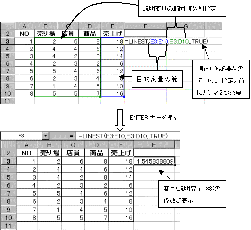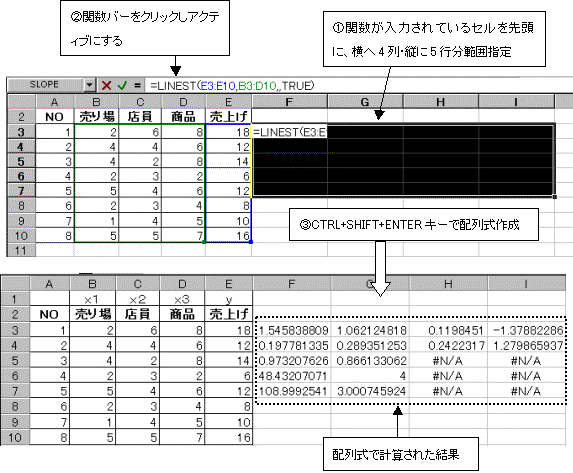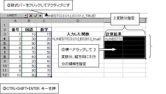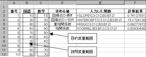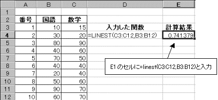 =linestŠÖ”:=linest(–Ú“I•ϗʔ͈Í,à–¾•ϗʔ͈Í,,true)