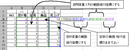 trendŠÖ”:=trend(–Ú“I•ϗʔ͈Í,à–¾•ϗʔ͈Í,’è”)‚Å‚ ‚邪A‚±‚±‚Å–Ú“I•ϗʂ͔͈͎w’èŒãf¥4ƒL[‚ð‰Ÿ‚µ‚ÄAâ‘ÎÀ•W‚É‚·‚éB‚Ü‚½à–¾•ϗʂ͈͎̔w’èŒã“¯—l‚Éf¥4ƒL[‚Åâ‘ÎÀ•\ަ‚·‚éB’蔂͈̔͂ÍAà–¾•Ï—Ê‚ÌX1¥X2¥X3‚Ìæ“ªs‚ðŽw’è‚·‚ê‚΂悢B‚±‚̂悤‚É‚µ‚Ä‚¨‚¯‚ÎA‚»‚̂܂܉º•ûŒü‚ÉŒü‚©‚Á‚ăRƒs[‚·‚邯‚·‚ׂĂ̗\‘ª’l‚ª‚·‚®‚É‹‚ß‚ç‚ê‚éB