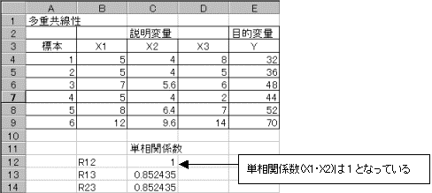 à–¾•Ï—Ê(X1`X3)‚Ì2•Ï—ÊŠÔ‚Ì’Pƒ‚È‘ŠŠÖŒW”‚ðu’P‘ŠŠÖŒW”v‚Æ‚¢‚¤B‚±‚Ì’P‘ŠŠÖŒW”‚ðà–¾•Ï—ÊŠÔ‚Å’²‚ׂéB’P‘ŠŠÖŒW”(X1¥X2):1@’P‘ŠŠÖŒW”(X1¥X3):0.852435@’P‘ŠŠÖŒW”(X2¥X3):0.852435@‚ƂȂÁ‚Ä‚¢‚éB’P‘ŠŠÖŒW”(X1¥X2)‚Í1‚ƂȂÁ‚Ä‚¢‚éB‚±‚Ì‚±‚Æ‚ÍAà–¾•Ï—ÊX1‚Æà–¾•Ï—ÊX2‚Í“¯‚¶Ž–‚ðà–¾‚µ‚Ä‚¢‚é‚Ì‚ÅA‚Ç‚¿‚ç‚©ˆê•û‚̕ϗʂðŽg—p‚·‚ê‚ÎA‘¼•û‚̕ϗʂ͕s—v‚ȕϗʂł ‚éB‚Ç‚¿‚ç‚©‚̕ϗʂ𗎂Ƃµ‚ÄAd‰ñ‹A•ªÍ‚ð‚·‚é•K—v‚ª‚ ‚éB