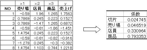 ‚±‚Ì•W€‰»‚³‚ꂽŠeƒf[ƒ^‚ðŽg—p‚µ‚ÄAd‰ñ‹A•ªÍ‚·‚邯AŠe•Ήñ‹AŒW”‚ÍAã‚̂悤‚È•\‚ƂȂéB‚±‚Ì•W€‰»‚³‚ꂽ•Ήñ‹AŒW”‚ðŒ©‚é‚ÆA¤•i‚̕Ήñ‹AŒW”‚ªˆê”Ô‘å‚«‚AŽŸ‚É“Xˆõ‚̕Ήñ‹AŒW”‚ƂȂÁ‚Ä‚¢‚éBà–¾•Ï—ÊX3(¤•i)‚Ì–Ú“I•Ï—Ê(”„ã‚°)—^‚¦‚é‰e‹¿‚ªˆê”Ô‘å‚«‚¢B