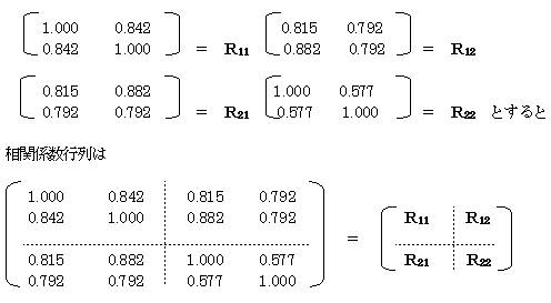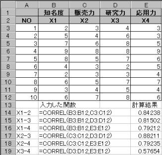 いま上記のように4変量ある時、知名度(X1)と販売力(X2)を合成した営業力と、研究力(X3)と応用力(X4)を合成した技術力とがどの様な関係にあるか正準相関係数を求めて調べてみる。