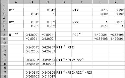 このZ1とW1の相関係数を求めると RZW =0.9679 となり第1正準相関係数に一致。