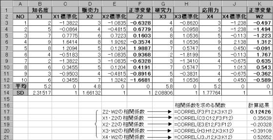 知名度(X1)と販売力(X2)の正準変量をZ、研究力(X3)と応用力(X4)の正準変量をWとする。それぞれの正準変量をZ=l1・X1+l2・X2 W=m1・X3+m2・X4 とする。