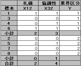 判別分析の例題は、説明変量が量的データであり、目的変量が質的データであった。この表を元にして、説明変量において、6点以上を該当あり、5点以下を該当無しとして新しい表を作成する。この新しく作成された表はすべて質的データであるから、数量化2類の分析を実施する。