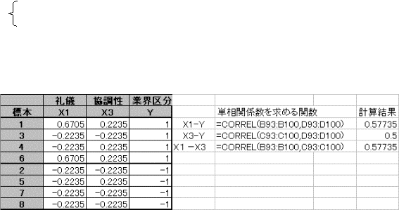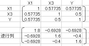 X1(礼儀)とYの単相関係数:0.57735 X2とYの単相関係数:0.5