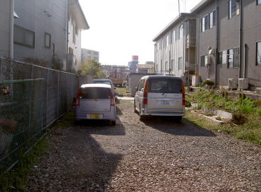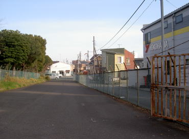 続いて日産車体・横浜ゴム製造線を辿ります。 専用線跡が分かるのはこの場所からで、先程の 分岐点からこの場所までの間は宅地化で消滅して いました。 細長い駐車場に転用されています。 |