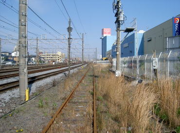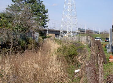 草生したカーブする専用線跡です。 このカーブする部分は東海道本線の下り電車から も見ることができます。 |
