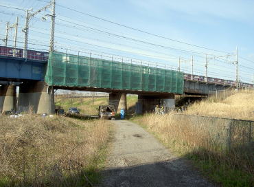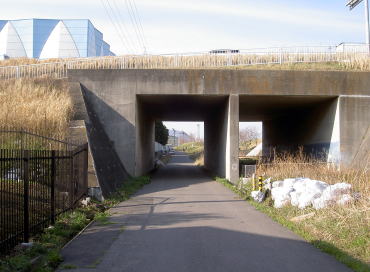 東海道本線の下を通る専用線跡です。 未舗装の遊歩道に転用されています。 |