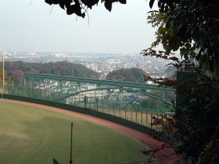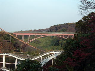 遠くにアーチ橋が見える。 フルーツパークの側を通った軌道はあのアーチ橋へ 繋がっていたようだ。 |
