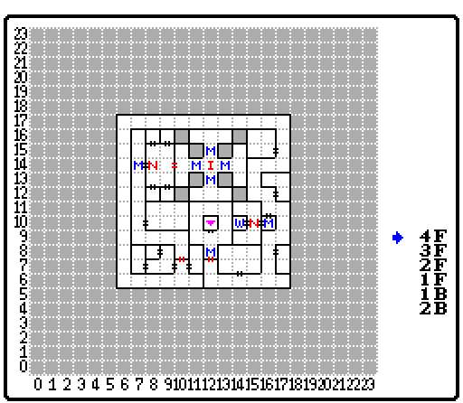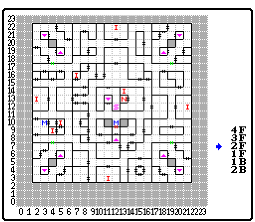 13.地上3階(N12-E10) シュゲン・ラマが居る。話し掛けると下の階に落とされるが、そのままシュートに落ちていくと地下1階へ着く。リトフェイトが効いている場合はパリオスの呪文で打ち消しておくと良い。