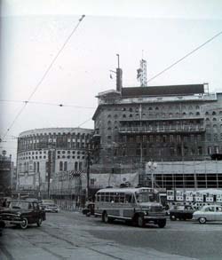 さらに、手前の丸い建物が有名な日劇。昭和8年12月開場以来、全国からの、「おのぼりさん」にも愛されたが、昭和59年3月、改築のため取り壊された(今のマリオン)。戦争末期の風船爆弾製造工場転用、戦後の宝くじ抽選会など、様々なエピソードも生んだが------------。