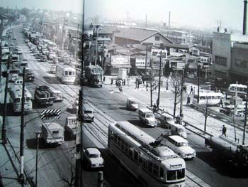 道路は、江戸時代からの東海道を広げた第1京浜国道で、産業道路も兼ね、トラックの往来が激しかった。左の高台は高級住宅地で、商店は国道に沿って並んでいた。この道を新橋と結んで、東京最初の路面電車が走ったのは、明治36年(1903)8月22日のことである。