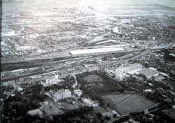 品川駅は品川区でなく港区にある。これは港区高輪台上空から見た風景。白く横たわる屋根は、開業を22日後に控えた東海道新幹線の車両基地である。