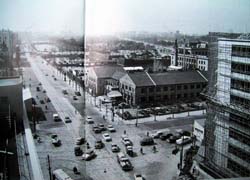 建設中のビルは、都立産業会館。中央の木造校舎のような建物は、日本鋼管の本社。朝鮮戦争の特需によって立ち直りかけた日本にとって鉄鋼生産は最重要基幹産業だった。この粗末な事務所へ大きなアメ車が出入りして、大いに活気にあふれていた。好調な経済成長に支えられて発展を続けた日本鋼管も、その実力を誇示するかのように昭和49年、高層ビルに建て替え、呼称もNKKと改めた。