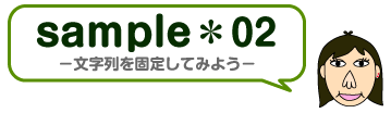 <html> <head> <script language="JavaScript"><!-- function ichikotei()// { sx = document.body.scrollLeft; sy = document.body.scrollTop; kotei.style.left= sx + 20; // kotei.style.top = sy + 100; // } // --></script> </head> <body onScroll="ichikotei()" bgcolor="#ffffff"> <a href="sample013.html" id="kotei" style="position:absolute;top:100px;left:20px;"><font size="4">トップページに戻る</font></a> <br><br><br><br> <center><img src="sample_img02.gif"></center> <br><br><br><br> </body> </html> |