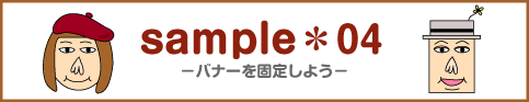 <html> <head> <script language="JavaScript"><!-- function ichikotei()// { sx = document.body.scrollLeft; sy = document.body.scrollTop; kotei.style.left= sx + 100; // kotei.style.top = sy + 100; // } // --></script> </head> <body onScroll="ichikotei()" bgcolor="#ffffff"> <img src="sample_banner.gif" id="kotei" style="position:absolute;top:100px;left:100px;"> <br><br><br><br><br><br><br><br><br><br> </body> </html> |