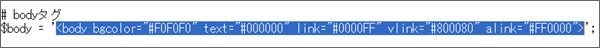 ページの背景色、文字色、リンク色などを「$body」に指定します。この文法はHTMLのBODYタグと同様です |