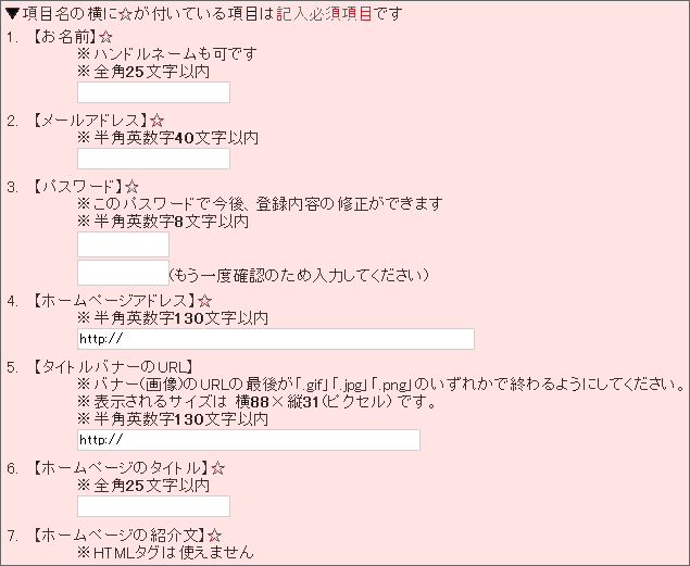 | アクセスランキングへの登録画面。ホームページのタイトル、URL、紹介文に加えて、バーナー画像を登録できるものもある。 |