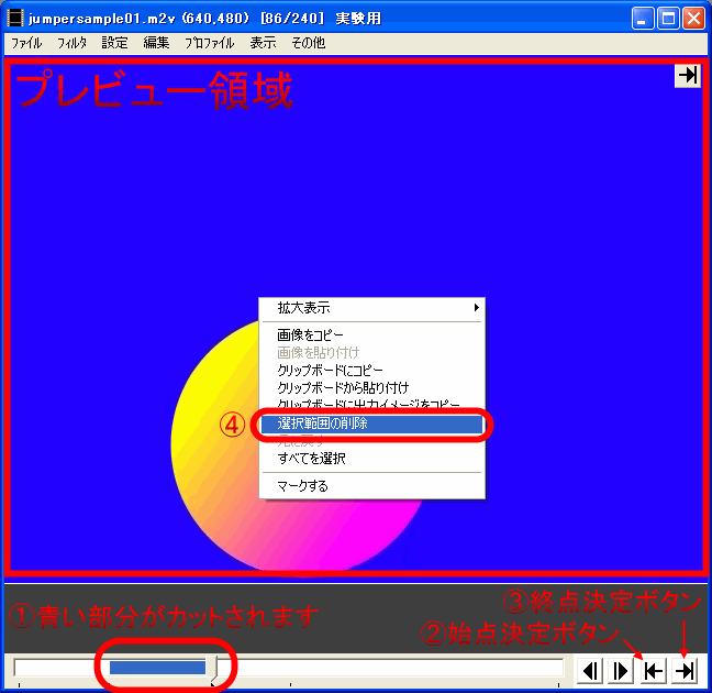 (1)カットしたい最初のフレームまで移動します。(1、のスライドバーや、1コマ送りボタン、ジャンプ移動を利用)
