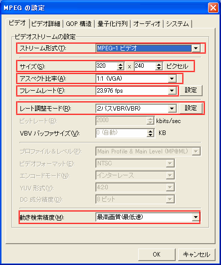 「ここではPC用の320×240のMPEG1動画を作る」設定とします。