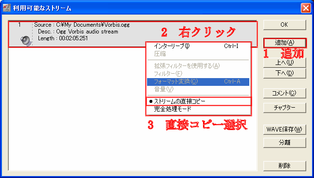 ここでは、すでにエンコード済みのAVI映像ファイルと、エンコード済みVorbis音声ファイルをMUXして、