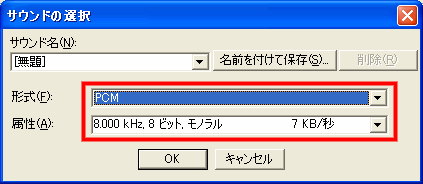 ただし、取り出すWAVEファイルのステータスは「PCM 8000Hz 8ビット モノラル」にしてください。