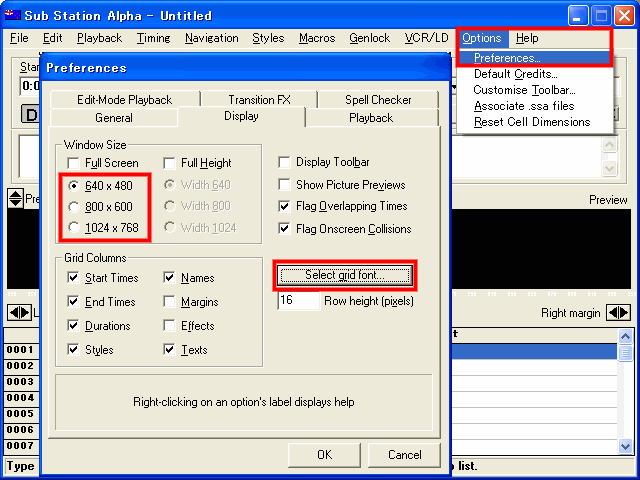 「options」→「Preferences」→「Display」で「Select grid font」のところを選択し、日本語フォントにします。