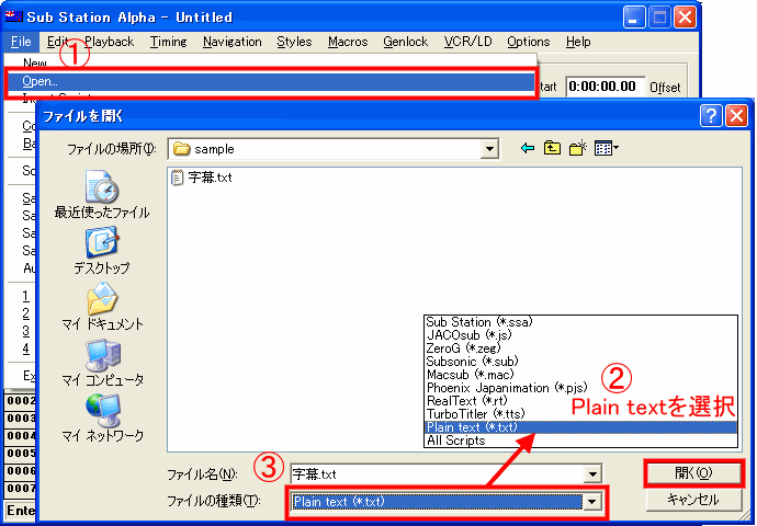 読み込むファイルの種類を「Plain Text」にしましょう。そうして、字幕ファイルを読み込みます。