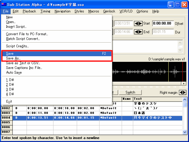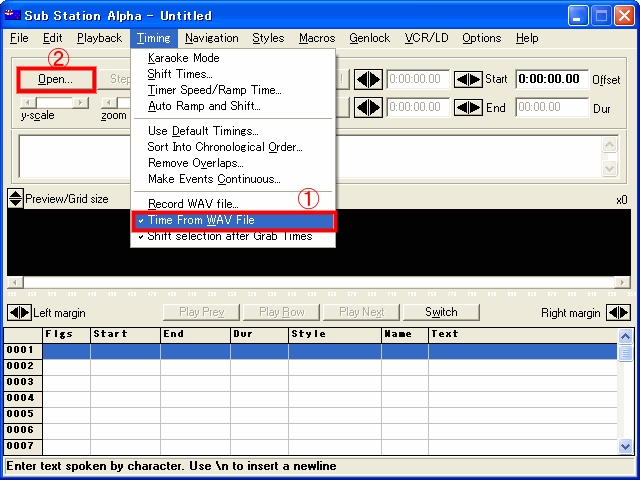 次に、字幕を表示するタイミングを作る「Sub Station Alpha」により、タイミング編集をします。