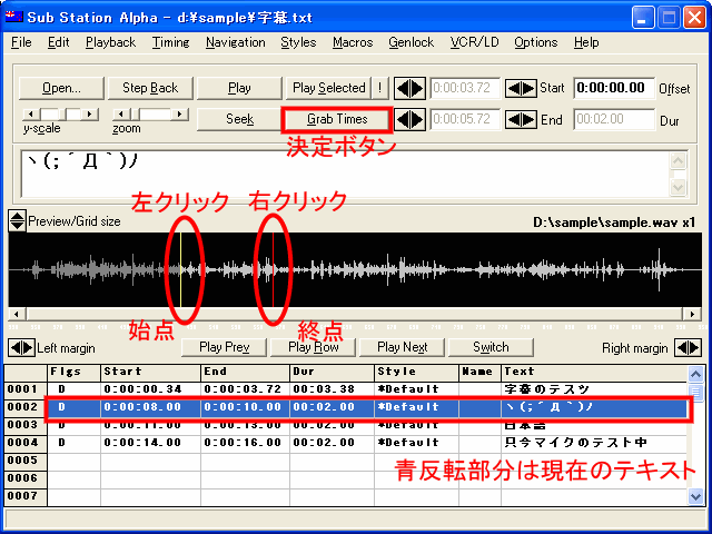 基本は、「字幕を表示したい始点を左クリックで指定」→「字幕を消したい場所で右クリック」→「Grab Timeボタンで決定」