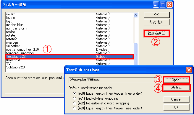 フィルタの中に「1、TextSub」というのがあるので、これを選び「2、読み込み」ます。