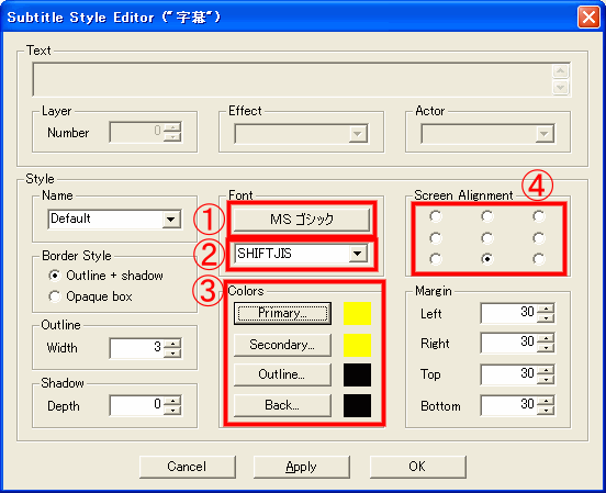 、字幕の色を選びます。(重要) Primary→文字の色です。縁を付けた場合は中の色です。