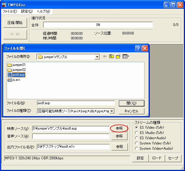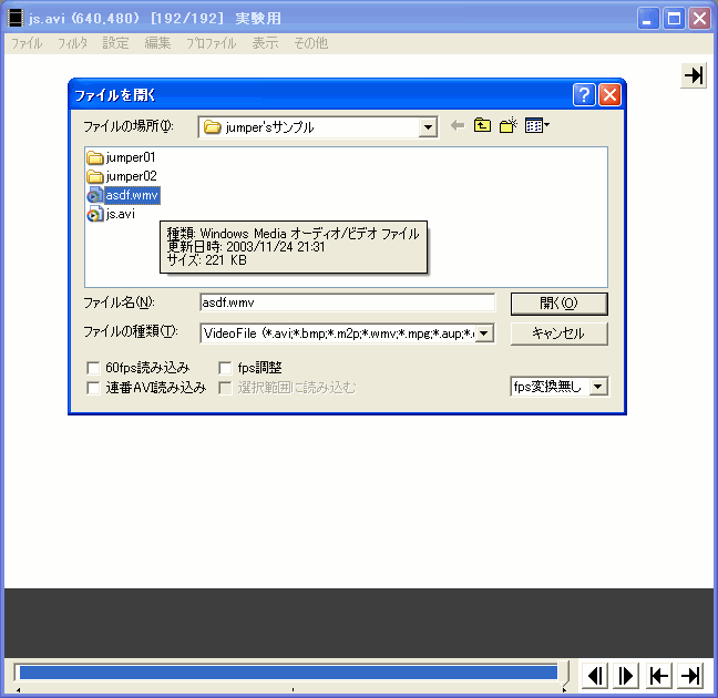 今回はWindows Media Video 9(WMV)を読み込んで、MPEG1にエンコードすることにします。