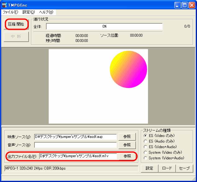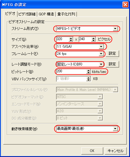 最後に、出力するMPEG1のビットレート等のステータスを決めます。