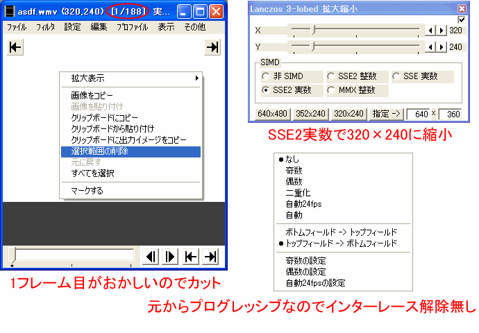 PCの動画なので、フィルタ処理はしません。ただし、作るMPEG1のサイズを考えてAviUtlプラグインの、